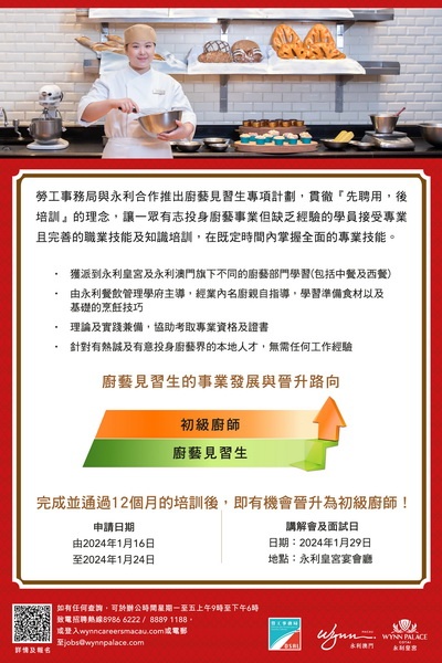 【本報消息】勞工事務局與永利澳門合作推出「永利廚藝見習生專項計劃」,以「先入職、後培訓」方式,培育有意投身廚藝事業但缺乏相關經驗的澳門居民,並提供專業及全方位培訓,藉此協助澳門居民發展職涯和推動向上流動。計劃由即日起接受申請。計劃提供「中廚見習生」及「西廚見習生」職缺各六個,合共12個職缺。獲錄取參加計劃者,將接受為期約12個月的一系列培訓,包括認識食品安全管制系統(HACCP)、考取酒店及飲食...