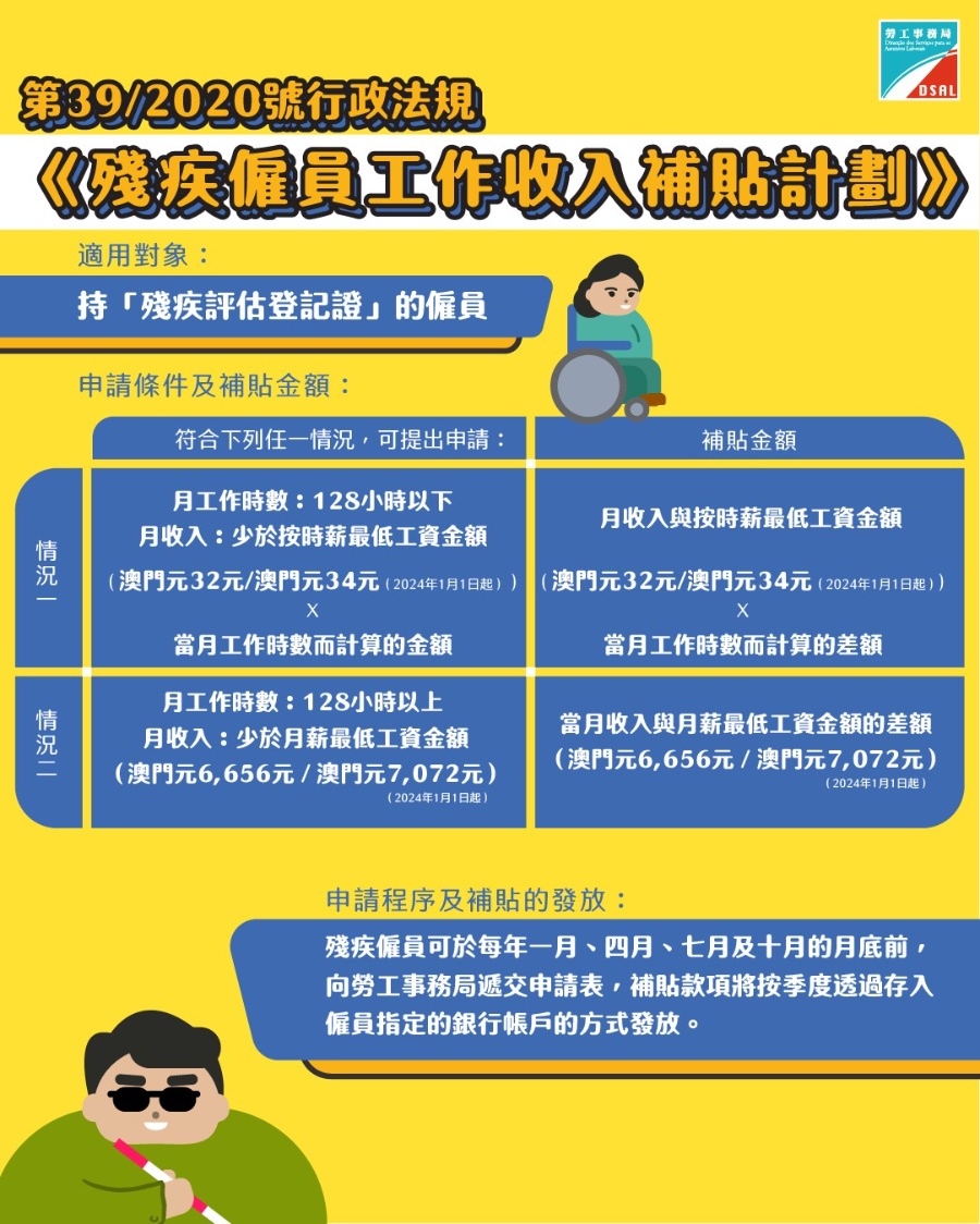 【本報消息】為支援殘疾人士就業,讓殘疾僱員獲得最基本的工資權益,特區政府於2020年11月1日推出《殘疾僱員工作收入補貼計劃》行政法規。根據規定,每年1月、4月、7月及10月接受前一季度的收入補貼申請,符合資格的殘疾僱員由 1 月2日起至1月31日可向勞工事務局申請2023年第四季的工作收入補貼。法規生效至今勞工局已接收12個季度的申請,累計收到243份申請,其中共有231個個案符合發放津貼的...