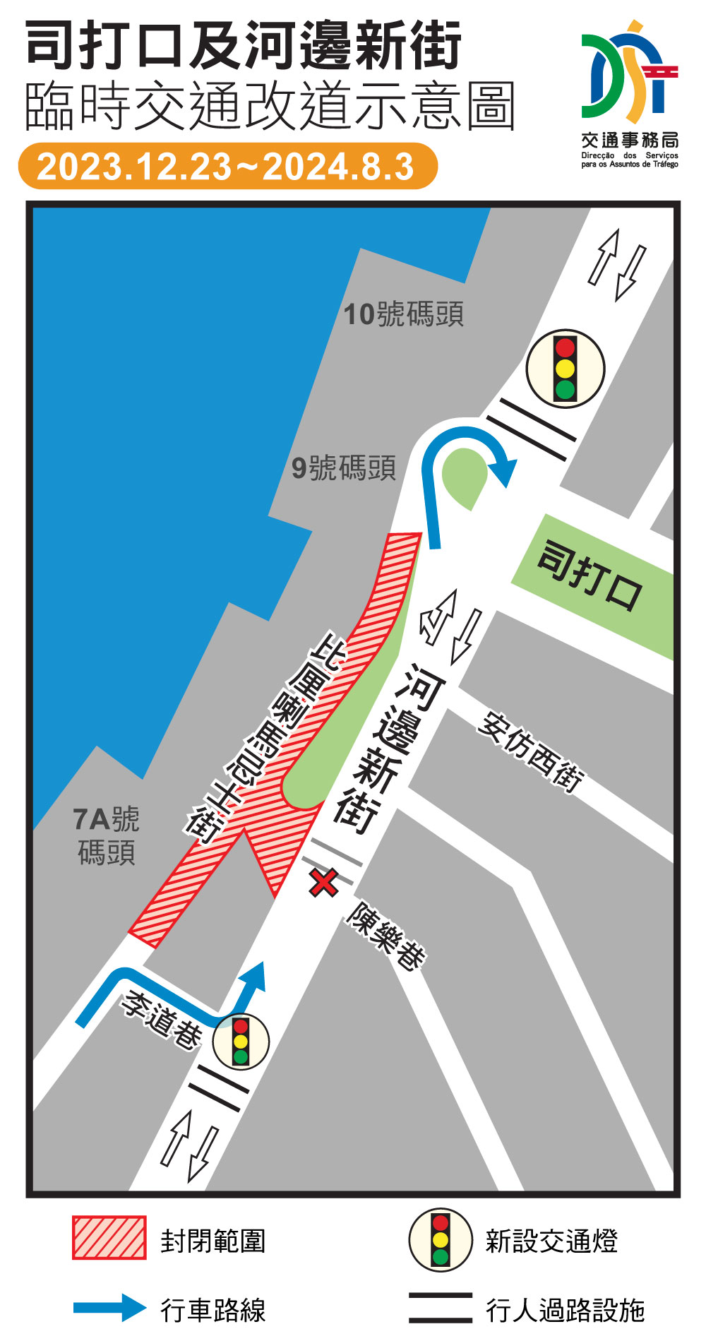 【本報消息】配合內港南雨水泵站及下水道工程的推進,介乎李道巷與南舢舨碼頭之間一段比厘喇馬忌士街,以及河邊新街近水字巷的中央調頭車道,於12月23日至2024年8月3日實施封閉交通,李道巷亦會臨時實施反方向行車,上述路段的上落客貨位亦會禁止車輛停泊,其他的臨時交通措施還包括禁止車輛由李道巷右轉入河邊新街、介乎陳樂巷與司打口之間一段河邊新街實施雙向行車巴士方面則維持現有安排。 公共建設...