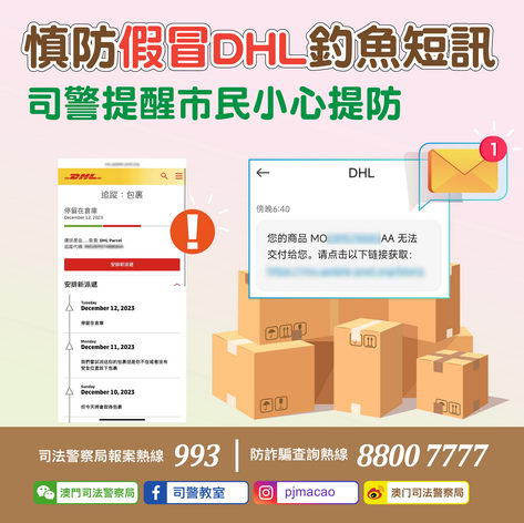 【本報消息】近日,司法警察局先後接獲多名市民舉報,稱收到假冒DHL快遞公司的詐騙短訊,以「商品無法交付」須繳付郵費為由,誘騙市民點擊短訊內的連結及輸入信用卡資料。 其中兩名事主因確實正在使用DHL的快遞服務,並有包裹等待簽收,故信以為真登入有關釣魚連結並輸入其信用卡資料以支付「郵費」,最終發現信用卡被不法盜用,合共造成損失約2.5萬澳門元。 司警反詐騙協調中心呼籲市民...