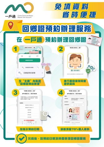 【本報消息】身份證明局表示,由即日起本澳居民可透過一戶通 預約辦理回鄉證,在居民的同意下,透過數據互聯,在預約時可免除填寫大部分個人資料,免填寫內容達七成,更方便快捷地完成預約辦證服務。 為更方便居民預約辦理回鄉證,特區政府與中華人民共和國出入境管理局委託的證件受理機構澳門中國旅行社合作,在一戶通推出回鄉證預約辦理服務。居民只需於一戶通主題分類內選取「回鄉證預約辦...