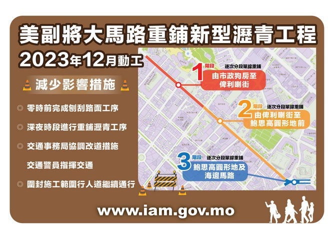 【本報消息】市政署將由12月11日晚起分階段重鋪美副將大馬路,為盡量減低對市民及周邊交通影響,工程將於晚上進行,採用新型瀝青實施即刨即鋪,日間路面可恢復通車,晚上再實施有限度通車,期間將有臨時交通安排。路面重鋪工程難免對市民及交通造成一定影響,對此敬請市民諒解。 是次重鋪路面工程,包括刨刮舊瀝青路面,使用新型瀝青重鋪,提高路面耐用性及摩擦度,提升行車安全,降低行車噪音...