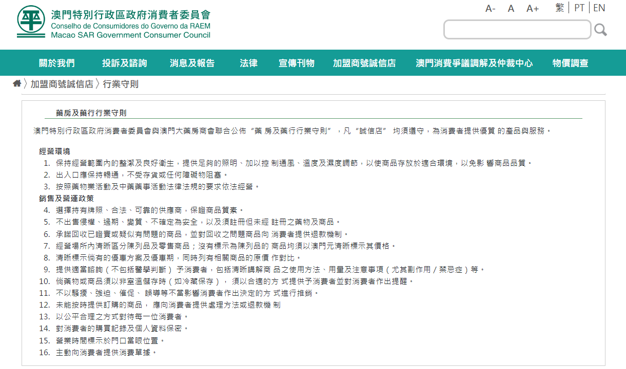 【本報消息】消費者委員會公佈新修訂的「藥房及藥行行業守則」,凡相關行業的「誠信店」均須遵守,為消費者提供優質的商品與服務。 消委會持續為「誠信店認可計劃」的各行各業制定守則,因應消費市場實況與發展,與時並進,適時優化實行中的行業守則。為提升藥房及藥行「誠信店」的服務質素,經徵集業界意見,消委會與澳門大藥房商會聯合公佈新修訂「藥房及藥行行業守則」。 守則...