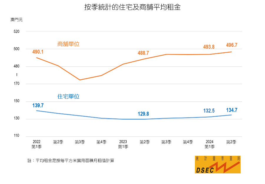 【本報消息】統計暨普查局資料顯示,今年第二季全澳住宅單位每平方米實用面積平均租金為135澳門元,較今年首季上升1.7%。其中,路環147元、黑沙環新填海區160元和外港及南灣湖新填海區138元的住宅平均租金分別上升5.5%、4.6%及2%,中區117元和新橋區120元則下跌0.4%及0.2%。按實用面積分組分析,小於50平方米、50至99.9平方米的住宅單位平均租金分別為166元及134元,按季...