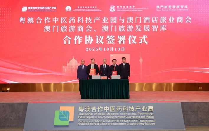 【本報消息】為積極回應國家戰略部署,深化澳琴文旅產業協同發展,粵澳合作中醫藥科技產業園13日與澳門酒店旅業商會、澳門旅遊商會及澳門旅遊發展智庫簽署合作協議,標誌著各方在「中醫藥大健康+旅遊」跨界融合發展道路上邁出堅實一步。簽約儀式在經濟財政司司長戴建業,中聯辦經濟部副部長楊全州,廣東省委橫琴工委委員、合作區執行委員會副主任符永革的見證下,由澳門酒店旅業商會會長、澳門旅遊商會理事長、澳門旅遊發展智庫...
