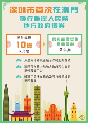 【本報消息】深圳市人民政府周二成功在澳門特區發行10億元人民幣地方政府債券,是深圳市首次在澳門發行離岸人民幣地方政府債券,也是首次在澳門發行以應對氣候變化為主題的綠色債券。澳門金融管理局對債券的成功發行致以祝賀,並感謝國家財政部、深圳市人民政府對澳門發展新金融業態的支持。此次債券發行面向專業投資者,發行規模為10億元,期限為3年,發行利率定價為1.74%,募集資金將用於深圳市內清潔交通等項目,並已...