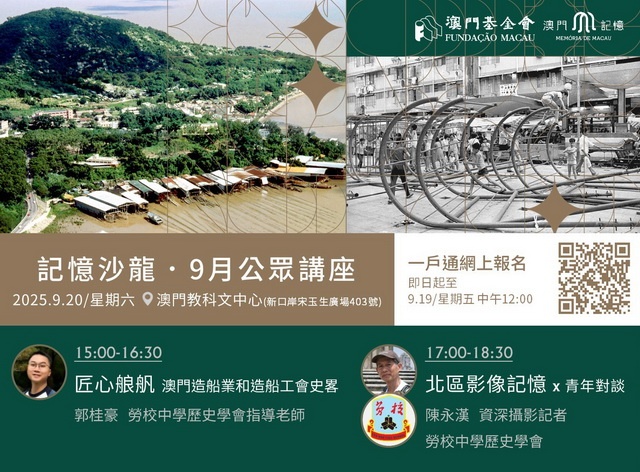 【本報消息】澳門基金會每月舉辦的「記憶沙龍」公眾講座廣受市民歡迎。隨著早前八月公眾講座的圓滿落幕,踏入九月開學季,繼續送上兩場全新主題講座,誠邀市民深入探索澳門歷史文化。九月公眾講座將於9月20日下午於澳門教科文中心舉行,分別由勞校中學歷史學會指導老師郭桂豪於四時至四時半主講「匠心艆舤—澳門造船業和造船工會史畧」,以及由資深攝影記者陳永漢與勞校中學歷史學會於五時至六時半共同帶來的「北區影像記憶x青...