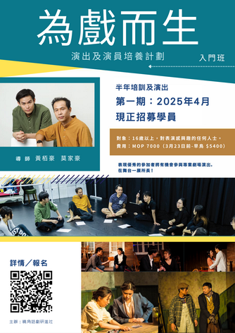 【本報消息】曉角話劇研進社第二屆「為戲而生演出及演員培養計劃」現正招募入門班學員,邀請資深劇場人黃栢豪、莫家豪作為重點戲劇導師。參加者將會展開連續六個月集訓,透過戲劇理論、身體訓練及實踐演出等方式,提升表演技巧、即興創作、劇本分析等能力,瞭解舞台各部門的技術運作,見證一個演出的誕生,成為澳門劇壇新力軍。表現優秀的參加者將有機會參與專業劇場演出,在舞台一展所長。計劃希望能培養全方位劇場人,強調熱身活...