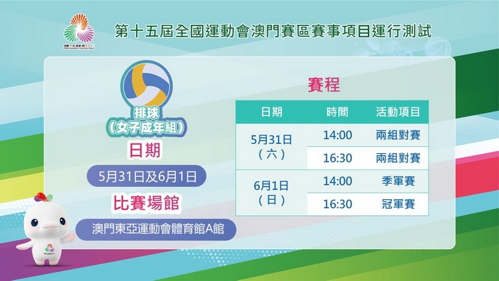 【本報消息】 第15五屆全國運動會澳門賽區排球(女子成年組)項目運行測試於5月31日及6月1日在澳門東亞運動會體育館A館舉行,活動由15運會及殘特奧會澳門賽區籌備辦公室主辦,中國澳門排球總會協辦,邀請了廣東、湖南與澳門兩支球隊作賽,賽事將於下午兩時開始,持票人士可在比賽開始前一小時入場,歡迎市民及旅客入場觀賞比賽。為方便市民和旅客領取門票,有興趣人士可於5月28日至30日在指定地點的開放時間內領取...