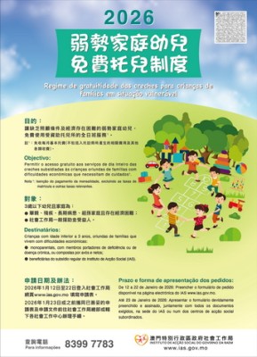 【本報消息】社會工作局協調30多間受資助托兒所推出「弱勢家庭幼兒免費托兒制度」,期望為缺乏照顧條件及經濟存在困難的弱勢家庭幼兒,提供申請免費使用受資助托兒所服務,並由1月12日起接受申請。有關制度的申請幼兒須為三歲以下的澳門特區居民;家庭屬單親、殘疾、長期病患、祖孫家庭或一般援助金受益人的家庭;家庭每月總收入上限不超過規定上限,其中二人家團至八人或以上家團的收入上限分別為19,975、27,550...