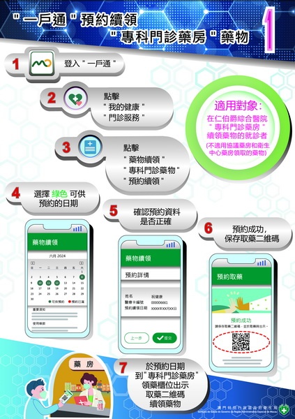 【本報消息】為配合特區政府電子政務發展,推動智慧醫療,進一步便利就診者或代領人領取仁伯爵綜合醫院專科門診藥物和縮短輪候領藥時間,衛生局於7月23日起優化一戶通預約續領「專科門診藥房」藥物服務。優化內容包括延長可續領藥物的日期及預約時間等,其中可續領藥物的日期現延長至原本續領藥物日期前後15天內,系統將自動顯示可預約續領的日期,不需自行計算。就診者最遲於續領藥物日期前一個工作天下午六時前進行預約即...