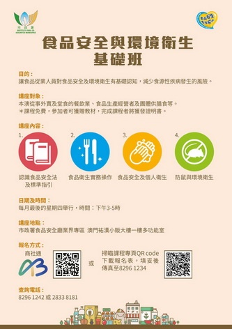 【本報消息】為提升食品業界的食安認知及操作水平,市政署持續提供系統性的食安培訓課程供在職業界人士報讀。11月份食品安全與環境衛生基礎班課程現正招生,歡迎業界踴躍報讀。「食品安全與環境衛生基礎班」課程內容包括《食品安全法》及標準指引、食品衛生實務操作、食品安全及個人衛生等,亦會講解預防和控制鼠患的有效方法,以提升業界對保持環境衛生及防治鼠患的意識。基礎班將於11月27日下午三時至五時,在祐漢小販大樓...