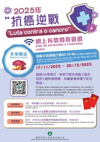 【本報消息】為落實《健康澳門藍圖》所訂定的總體目標和指標,積極推動「健康社區」計劃,貫徹資源下沉至社區,衛生局持續開展多元化健康科普活動,自去年起每季度均舉辦「抗癌逆戰」網上有獎問答遊戲,透過問答形式傳遞正確的預防癌症和篩查資訊,提升居民對預防癌症的意識與關注度,進一步推動其實踐健康生活和主動健康管理,降低癌症發生的風險。衛生局由11月17日起開展今年最後一場「抗癌逆戰」網上有獎問答遊戲(冬季限定...